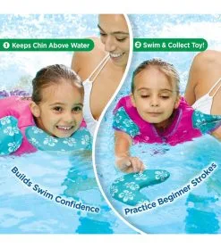 - BUILT-IN FLEX-FORM FOAM PADS: Balanced flotation and designed to place child in the prone (swim) position while the Padded Chin-Up Collar keeps their head above water; Removable Collar is also a swim and collect toy for swim practice