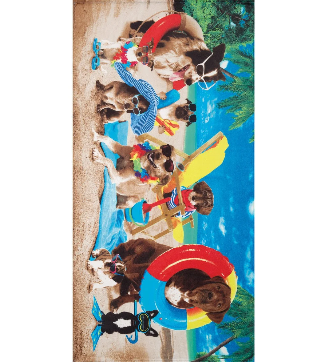 You may not always get to go to the dog beach, but you can relax with a bunch of beach-lovinβ pooches. The Dohler 30β x 60β Dogs At The Beach Towel features a colorful group of pups waiting for their chance to splash in the surf. Its soft fabric always feels good against your skin.