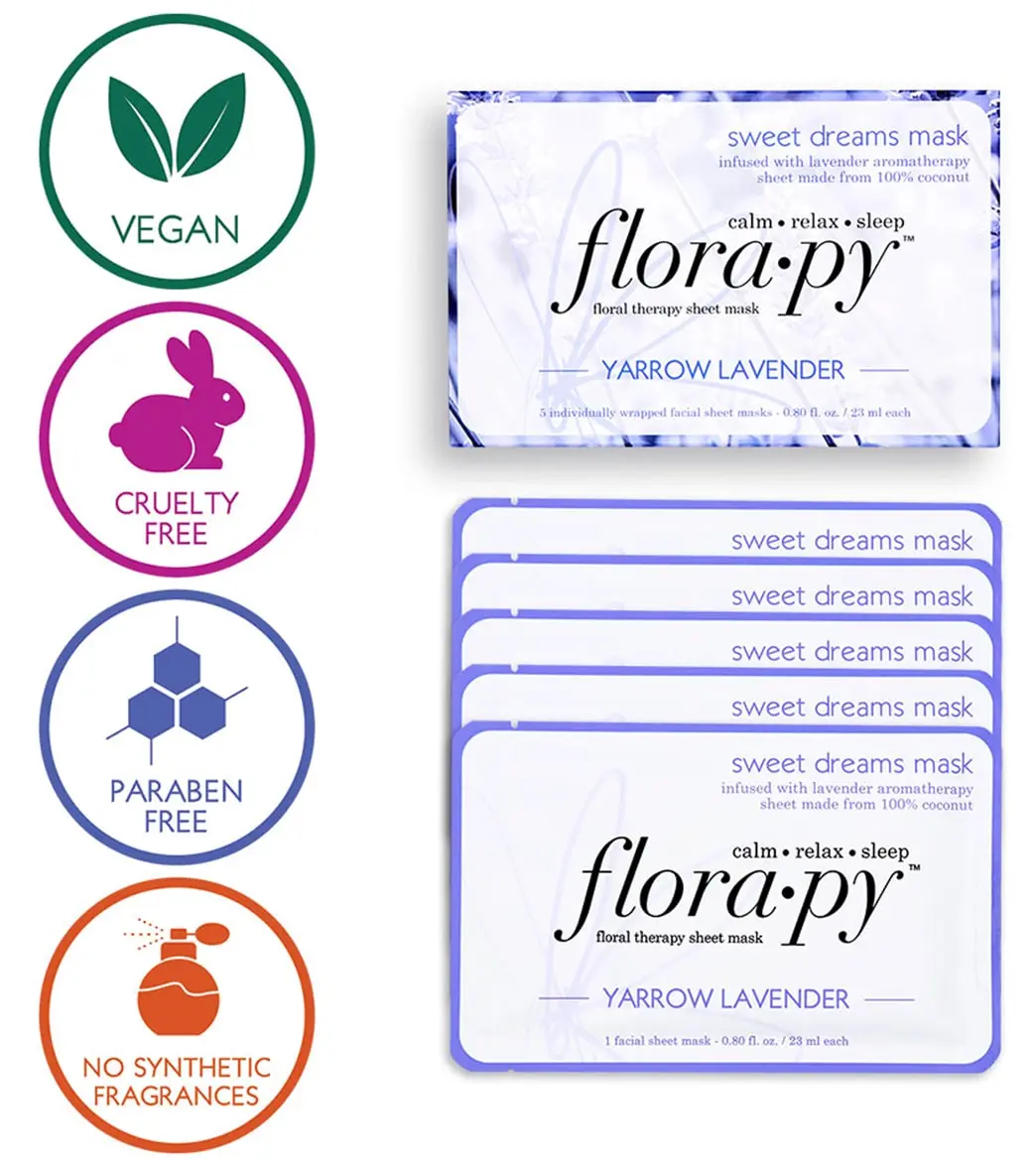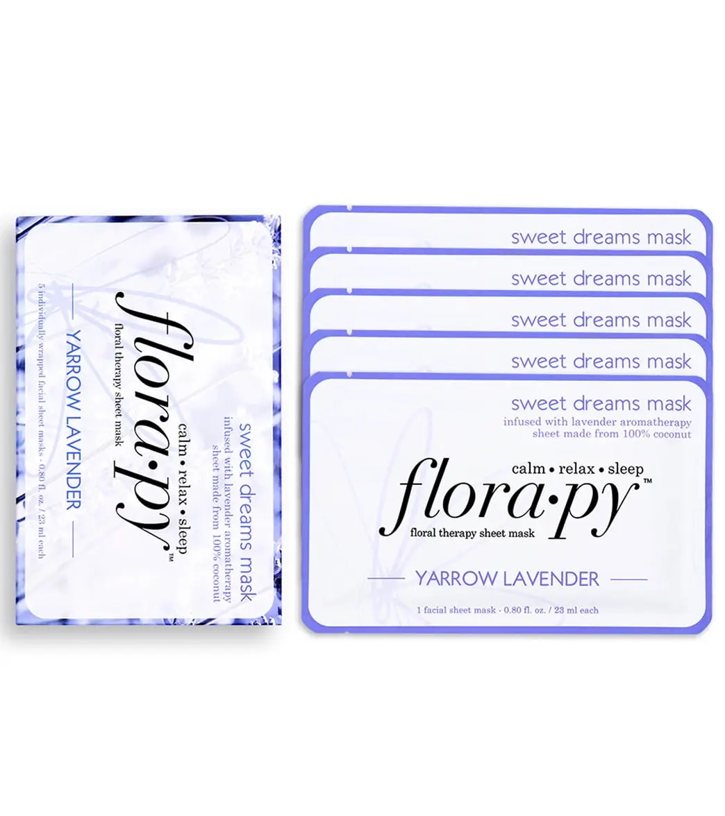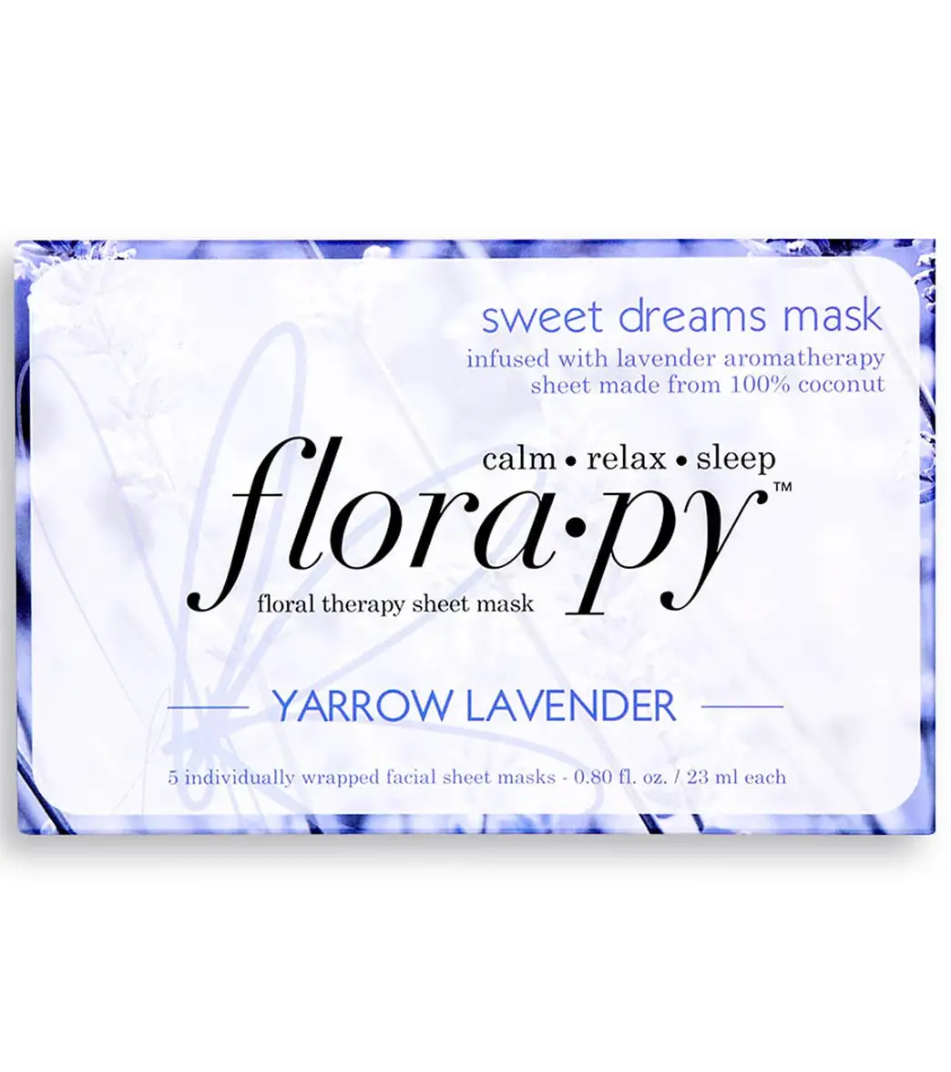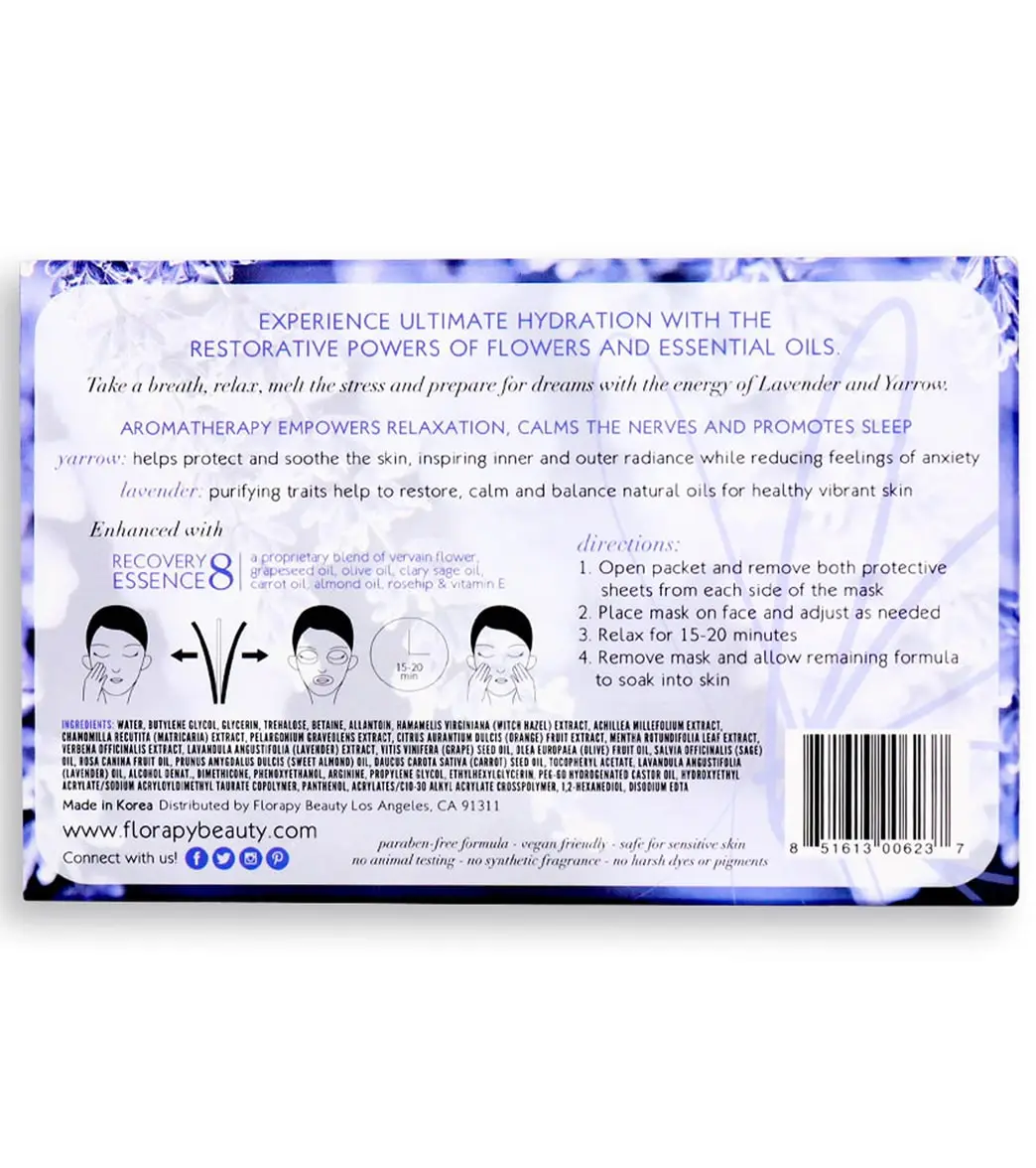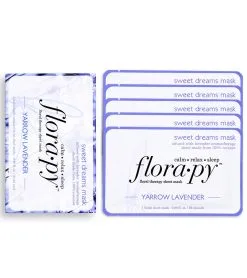 Relax and recharge with the Florapy Sweet Dreams Aromatherapy Sheet Mask 5 Count, Yarrow Lavender.