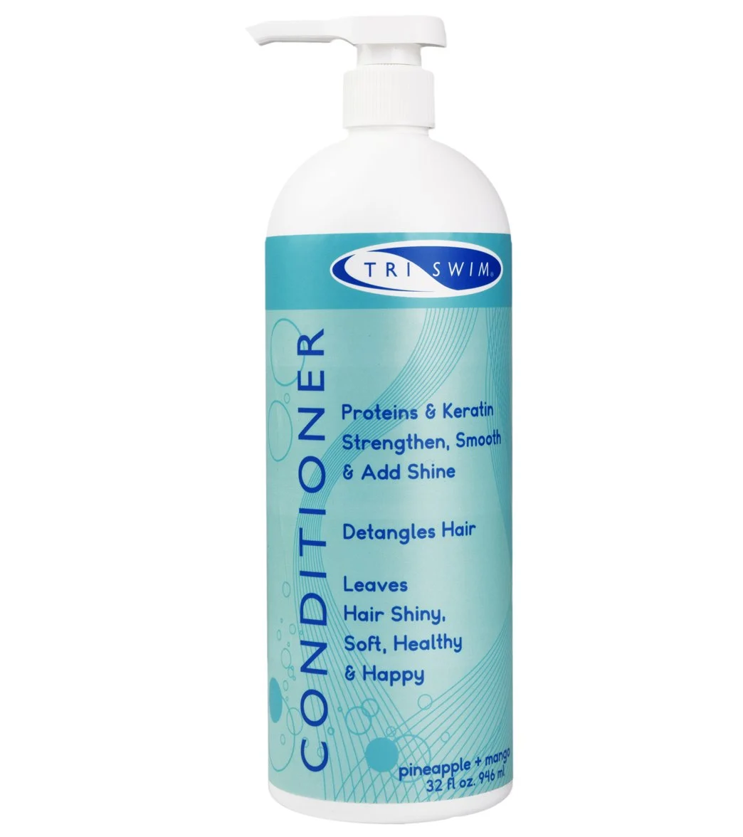 TRISWIM Repairing Conditioner is a swimmer’s must-have hair care product. With the laboratory-tested power of proteins and Keratin, this product hydrates your dry and damaged hair caused by Chlorine, Bromine, hard water minerals, and salt water. TRISWIM Conditioner leaves hair shinier, softer, and all-around healthier. Enjoy the delightful pineapple + mango scent; you must smell to believe! TRISWIM Swimmer’s Conditioner is part of the #1 rated swim products by United States Masters Swimming, Aqua Exercise Association, and Masters Swimming Canada.