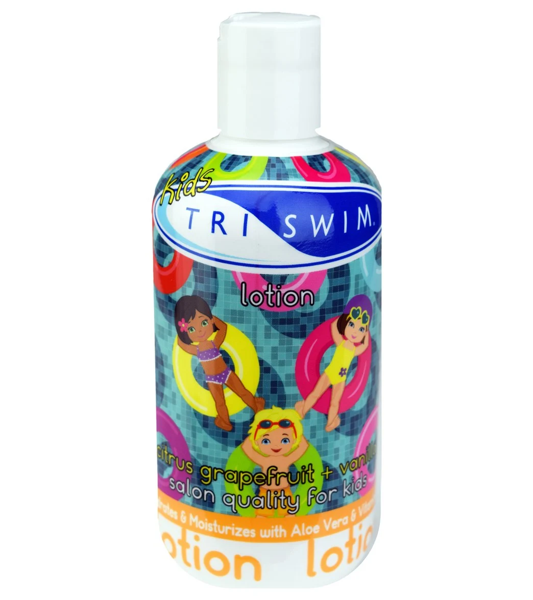 Repair your child’s dry skin with the TRISWIM KIDS Lotion for swimmers. Our high-tech formula combines organic Aloe Vera, Vitamin E, & Pro-Vitamin B5 to replenish moisture and hydration that heals skin. Our lotion also helps provide dry itchy skin relief from Chlorine, salt water, hard water minerals, Bromine & sunburned skin. Enjoy a light citrus grapefruit scent and a non-greasy, soft-to-touch lotion. TRISWIM KIDS Swimmer’s Lotion is the #1 rated swim lotion by United States Swimming Schools.