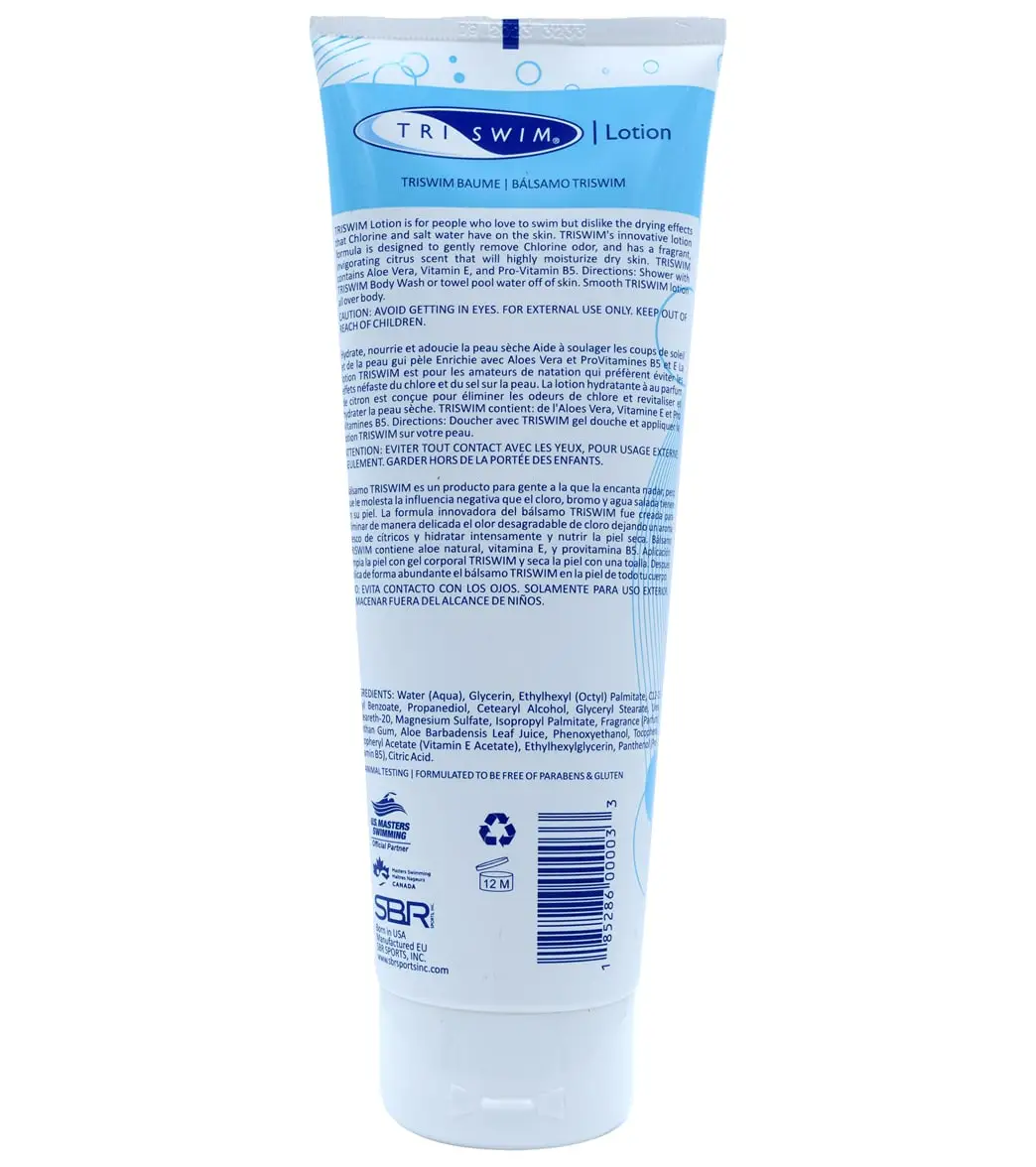 Relieve your dry skin with TRISWIM Swimmer’s Lotion. Formulated with Aloe Vera, Vitamin E, and Pro-Vitamin B5, your skin will feel relief from dryness, itchiness, sunburn and peeling that is associated with swimming and participating in outdoor activities. The lotion has an enriching citrus grapefruit scent and a non-greasy, soft-to-touch, lasting effect. TRISWIM Swimmer’s Lotion is part of the #1 rated swim products by United States Masters Swimming, Aqua Exercise Association and Masters Swimming Canada.
